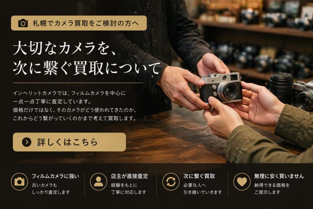 札幌市でカメラを専門に扱う中古カメラ店はあまりないのではないでしょうか。インヘリットカメラは数少ない中古カメラを取り扱うカメラ店となります。